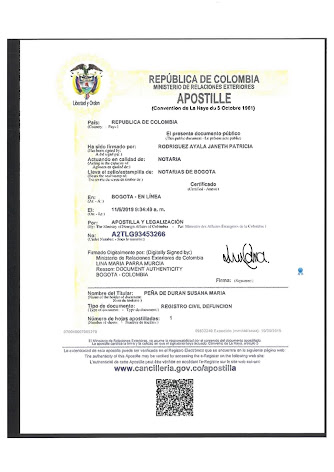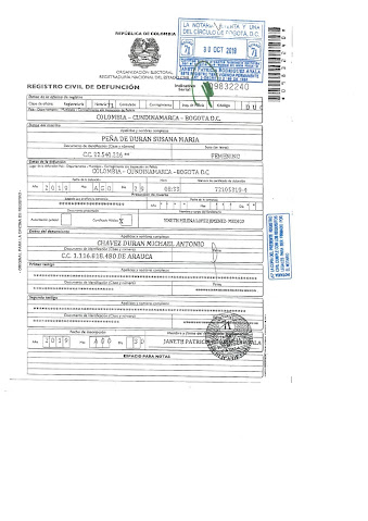 Actualmente tengo un certificado de defunción colombiano que incumple todos los requisitos legales que debe tener un documento de des etas características para ser legal, certificado por una presunta notaria de quien tengo dudas que esté legitimada para actuar como tal. Por si no ésto no fuese bastante, tengo un documento presentado por la policía de Bogotá ante la Fiscalía 16 de Colombia en el que la familia afirma abiertamente que mi esposa, en noviembre de 2020 estaba viva y yo, supuestamente viviendo en Colombia la estaba "acosando" y "amenazando su vida e integridad", solicitando ,a la policía (noviembre 20) protección hacia m esposa (fallecida quince meses antes) lo que causó otra denuncia penal por calumnias, falsa denuncia y fraude procesal
